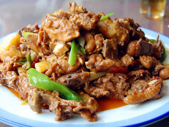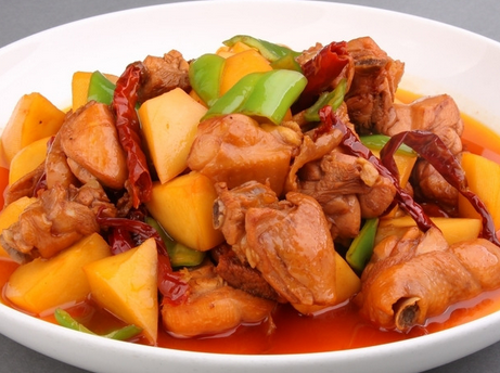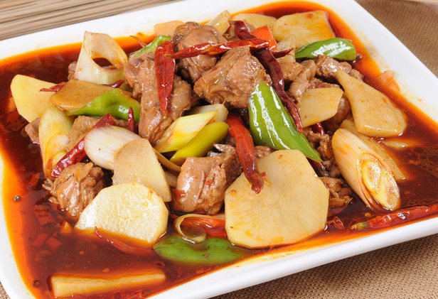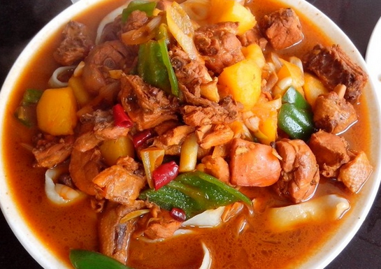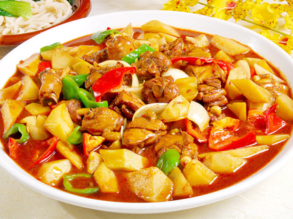 新疆大盤雞是新疆地區(qū)名菜,來源說法多種,真實的來源已無法考究,大約起源于80年代后期,主要用料為雞塊和土豆塊,配皮帶面烹飪而成。菜品色彩鮮艷,有爽滑麻辣的雞肉和軟糯甜潤的土豆,辣中有香,粗中帶細,而且經濟實惠,親朋聚會食用尚佳。