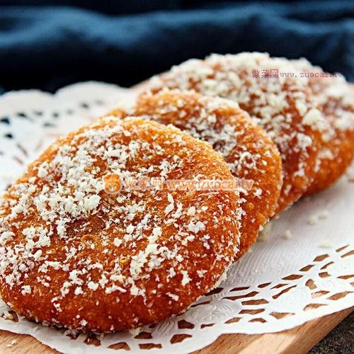 15.盤中放適量椰蓉,把南瓜餅趁熱粘滿椰蓉即可。