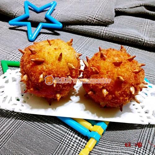 5.接著把揉好的糯米團(tuán)先粘一次打散的雞蛋液,再沾面包糠,然后再反復(fù)粘一次雞蛋液,再是面包糠,重復(fù)兩次即可。