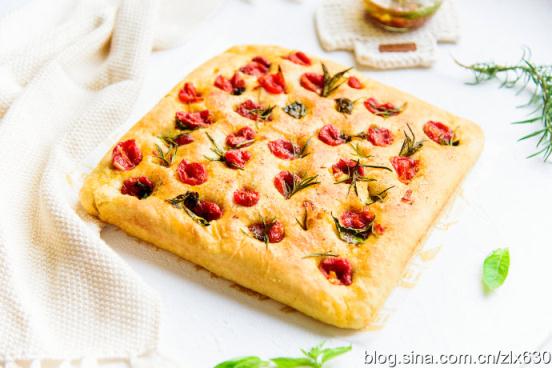 佛卡夏是一款原產(chǎn)意大利的扁面包,上面通常會(huì)撒上香草,或者其它食材,與披薩有些類似。所以我一般都稱它為中式披薩,只因?yàn)榭诟姓娴暮痛?u data-h0SO="mJ5DfN">餅很像。烤制好的佛卡夏,咬上一口滿滿的都是酸甜的小番茄和香料的味道,深受家人的喜歡。