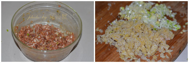 4、蔥姜切碎,酸菜切碎。將蔥姜酸菜跟肉餡拌在一起,加芝麻油拌均勻。
