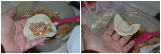 5、取一張餃子皮,放上餡料,冬天的餃子皮比較硬,不是很好捏,抹點(diǎn)兒水就好捏了。