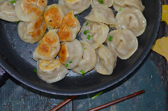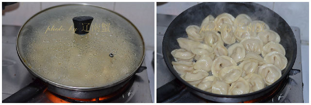 11、然后加蓋小火煎,有水蒸汽,餃子熟的很快了。