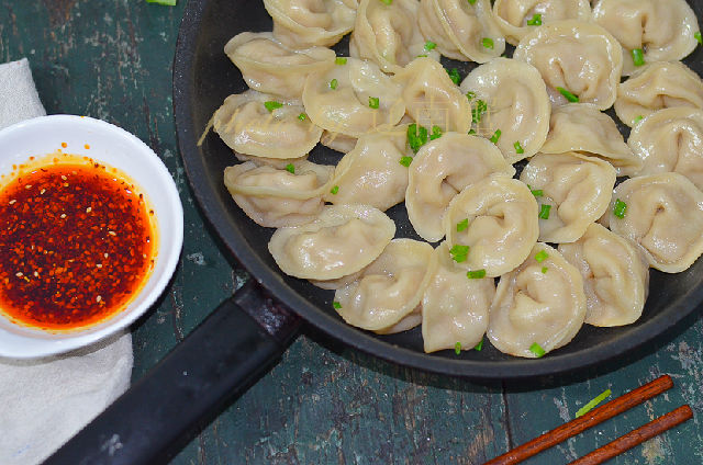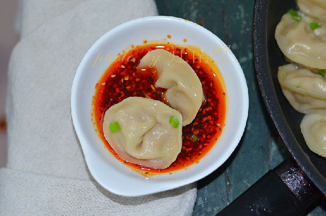 12、水快完的時候,開蓋,讓水汽完全蒸發(fā),餃子就好了。放上小蔥碎,配上味兒碟,可以開吃了。