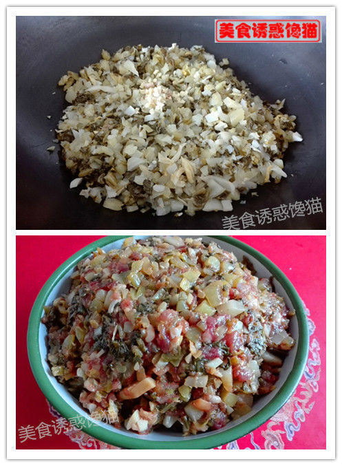 1、將酸菜、姜、牛肉洗凈、剁碎,酸菜入鍋把水稍炒干,加入牛肉末、姜、植物油、鹽、蠔油、雞精、淀粉,順一個(gè)方向攪拌均勻,備用。