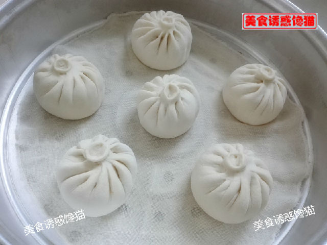 6、包好包子后,放入鋪有濕屜布的蒸籠上,中間要有間隔,因?yàn)檎舻臅r(shí)候還會(huì)變大。二次醒發(fā)20分鐘(根據(jù)溫度調(diào)整醒發(fā)時(shí)間)至二倍大。