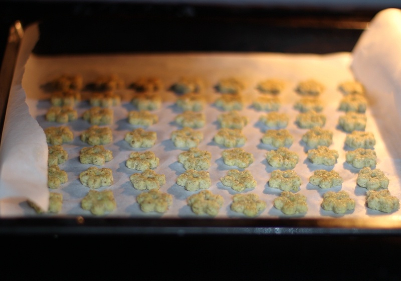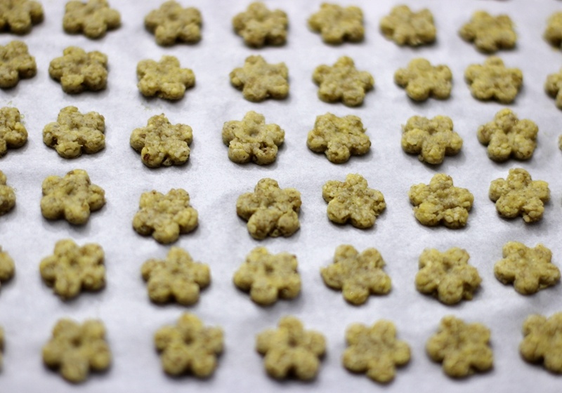 放入預(yù)熱的烤箱中層,上下火,180度,20分鐘左右,時(shí)間要根據(jù)餅干大小來定,直到烤脆為止。