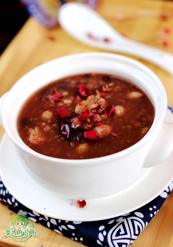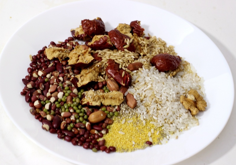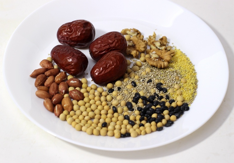 黃豆15克、黑豆15克、三色小米各10克、藜麥10克、花生20克、核桃兩個(gè)、紅棗四個(gè)