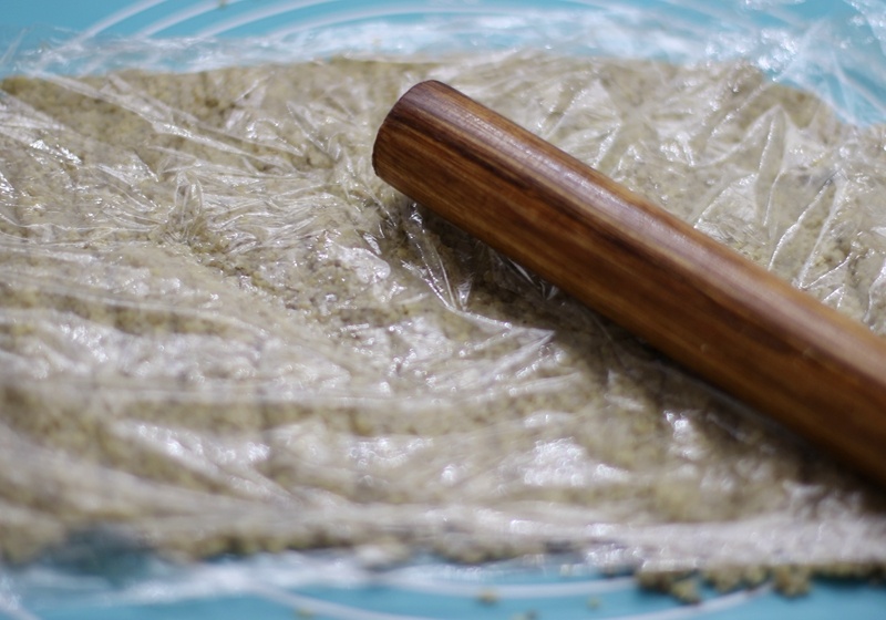 將拌好的材料裝入保鮮袋里,用搟面杖反復(fù)敲打,這一步是為了黏性更強(qiáng)。