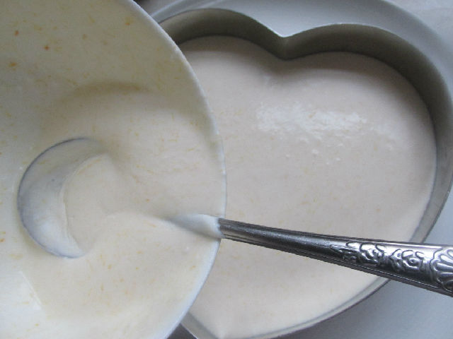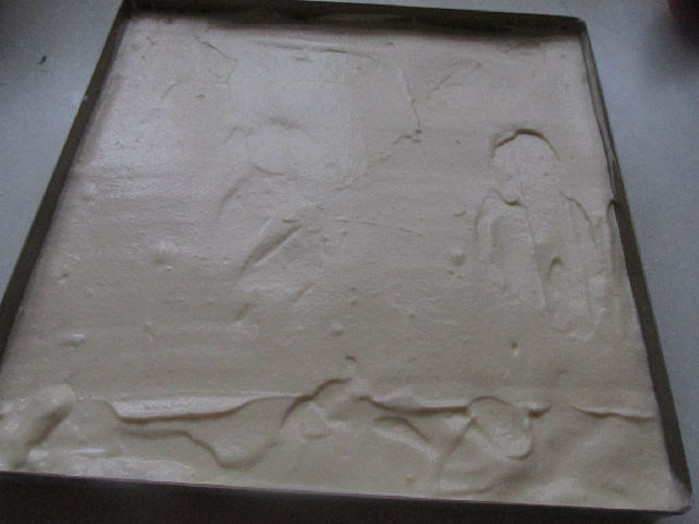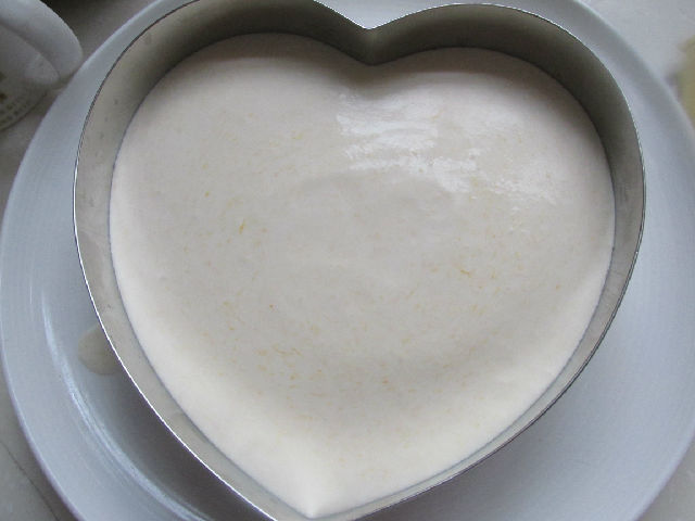 9,把慕斯糊倒入慕斯圈中的蛋糕上面。