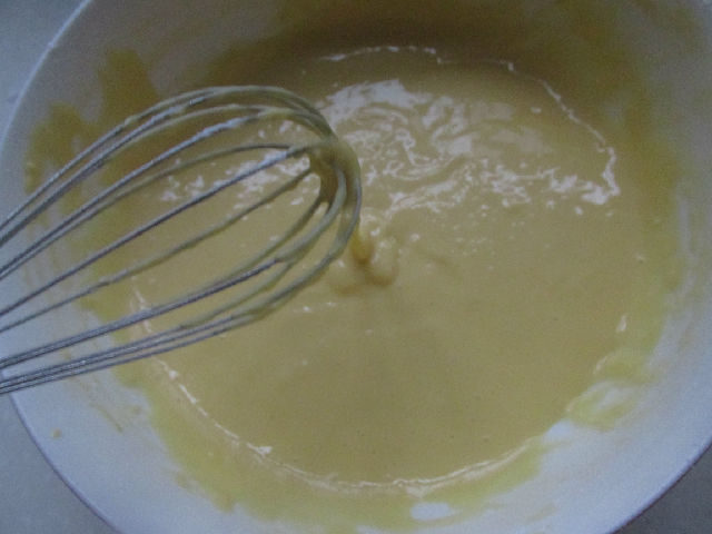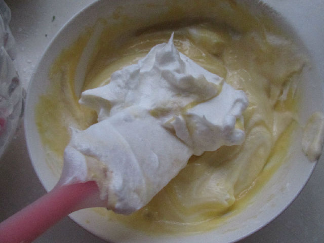 4,把蛋白霜加到蛋黃糊中翻拌均勻。