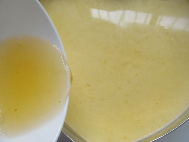 2,把蛋黃沙棘汁和葵花籽油一起攪拌均勻,篩入面粉拌勻,成蛋黃糊。