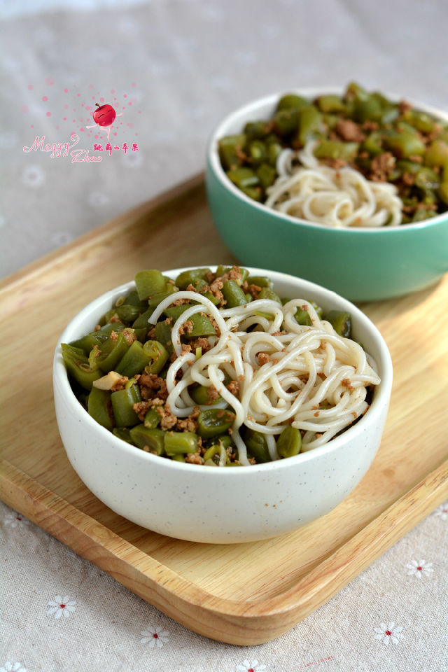 材料:豆角600克,豬肉餡300克,植物油適量,大蒜4瓣,醬油適量,鹽適量,面條適量
