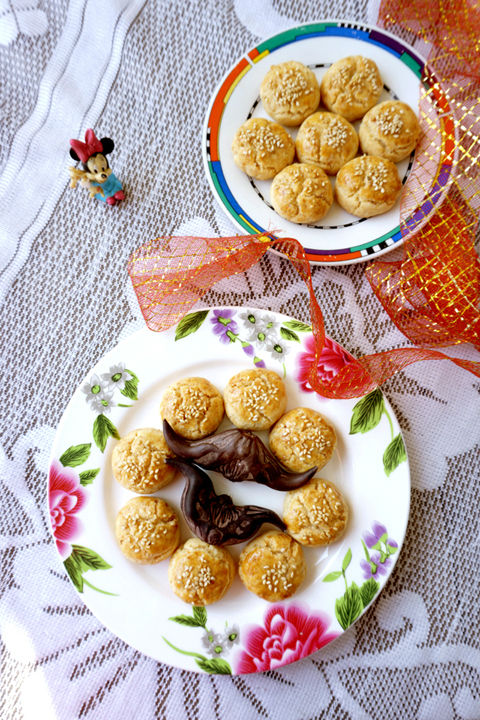 2、取適量,做成均勻小圓餅狀。擺入烤盤,表面刷蛋液,粘上芝麻,放入烤箱,中層,上下火,180度,烤約20分鐘左右。表面金黃,出爐。