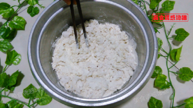 3、面粉與酵母混合,慢慢倒入溫水,邊倒邊用筷子攪拌成絮狀。