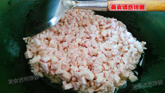 1、將香芋切成丁,鍋里倒些油,放入香芋,炒熟。