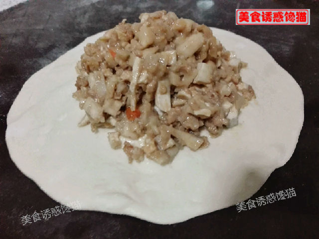 6、將小劑子搟成包子皮,包入香芋叉燒醬肉餡。