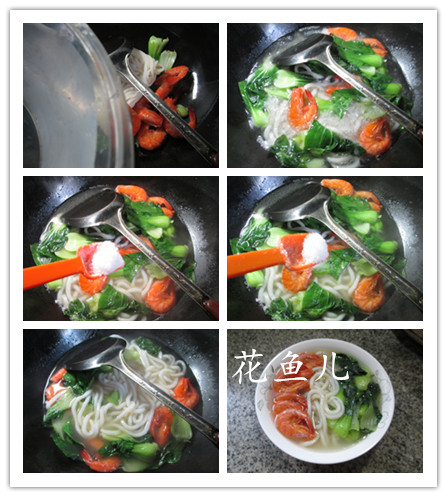 (2)接著,合入烏冬面和蝦干,加適量的清水翻動一下煮開。