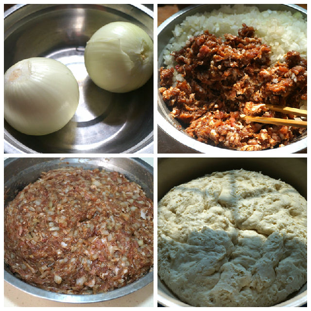 材料:面粉1000克,酵母10克,清水650克左右,豬肉餡700克,洋蔥兩個,醬油適量、生抽適量、鹽適量,植物油少許