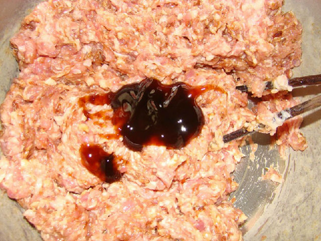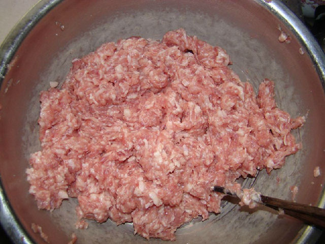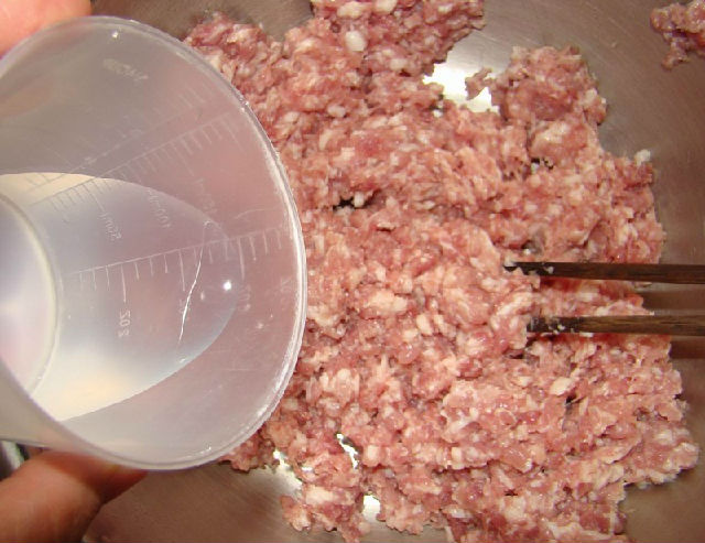 5,筷子以同一方向?qū)⑺謹(jǐn)嚾肴怵W中,每次都在水分完全被肉餡吸收后再加水。打好后的肉質(zhì)具粘性,顏色變淡。
