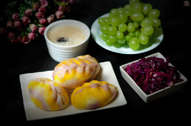 C(紫色面團(tuán))紫甘藍(lán)汁100克,面粉180克,糖10克,酵母粉2克