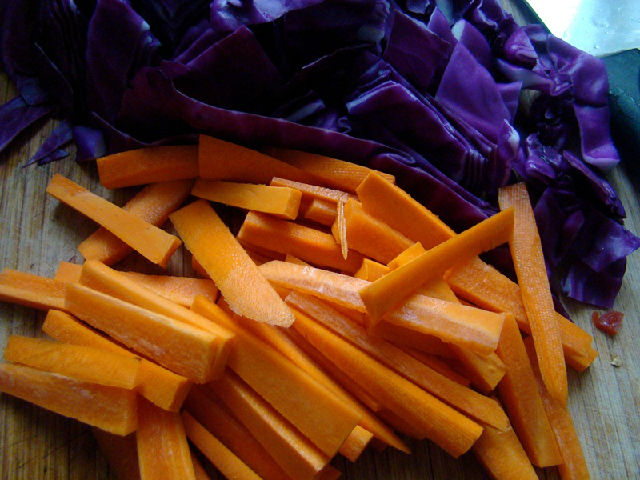1,把胡蘿卜和紫甘藍(lán)切小塊。