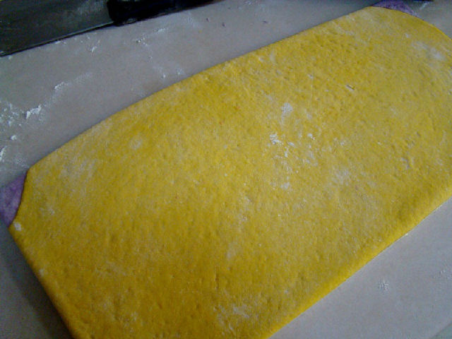 12,搟成長(zhǎng)方形片重疊在一起,用刀將不整齊的邊緣切除。(中間層刷點(diǎn)清水可使它更好粘合。)