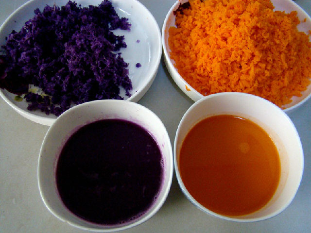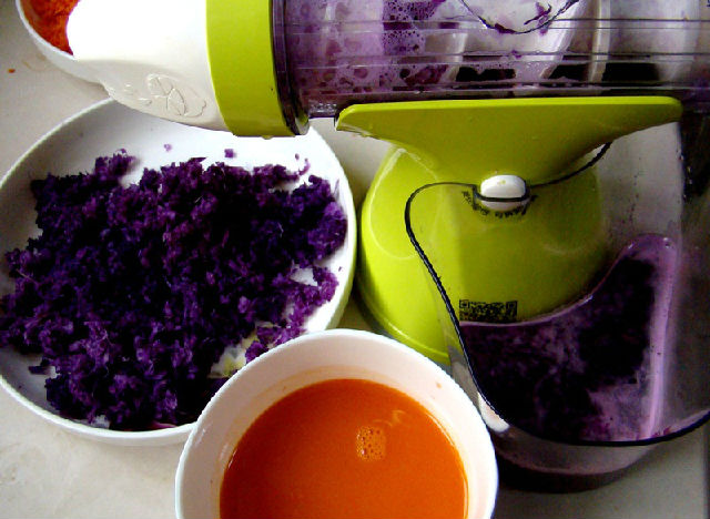 3,胡蘿卜汁和紫甘藍(lán)汁分別取100克,胡蘿卜渣和紫甘藍(lán)渣不要丟棄。