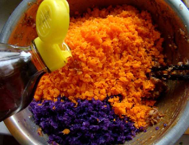 9,胡蘿卜渣和紫甘藍(lán)渣加少許香油拌一下。