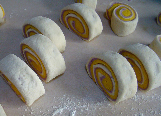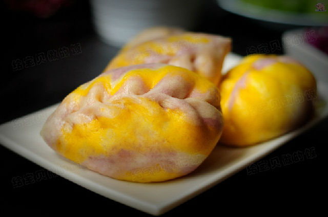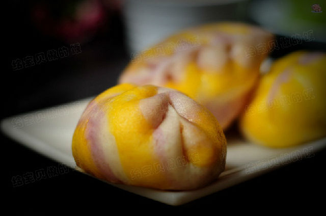 B(黃色面團(tuán))胡蘿卜汁100克,面粉180克,糖10克,酵母粉2克