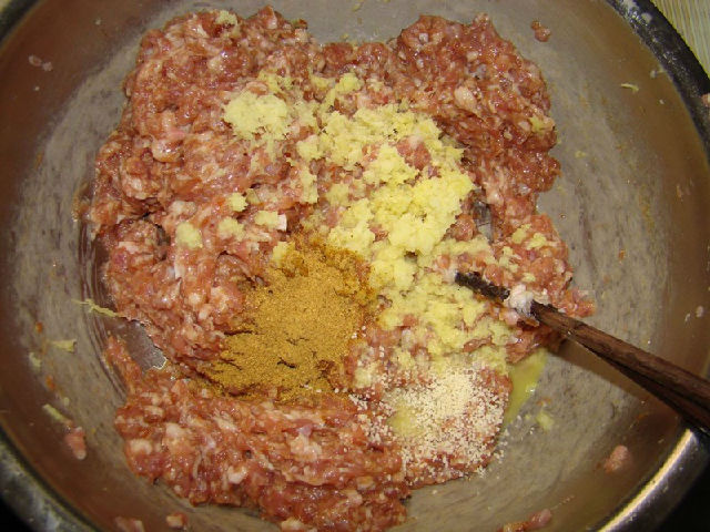 4,將少許鹽加入肉餡中。將水以少量多次方式加入肉餡中。(加入鹽有助于水分的吸收)