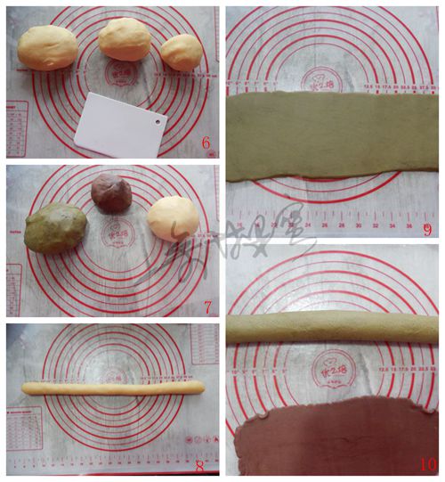 7、最大面團(tuán)加入抹茶粉。中等面團(tuán)加入吉士粉,小面團(tuán)加入可可粉。輕輕捏勻。
