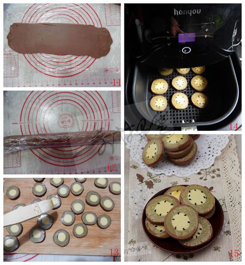 13、取出凍好面團(tuán),切為0.5CM厚餅干坯,涮上蛋液,用芝麻裝飾。