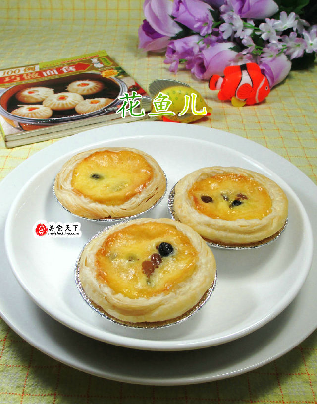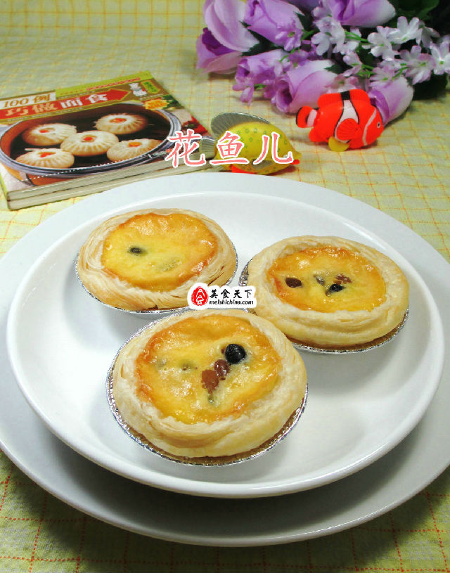 (4)然后,將蛋撻皮置入烤盤(pán)中,擱入蜜豆、用勺子舀入牛奶蛋液。