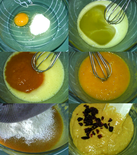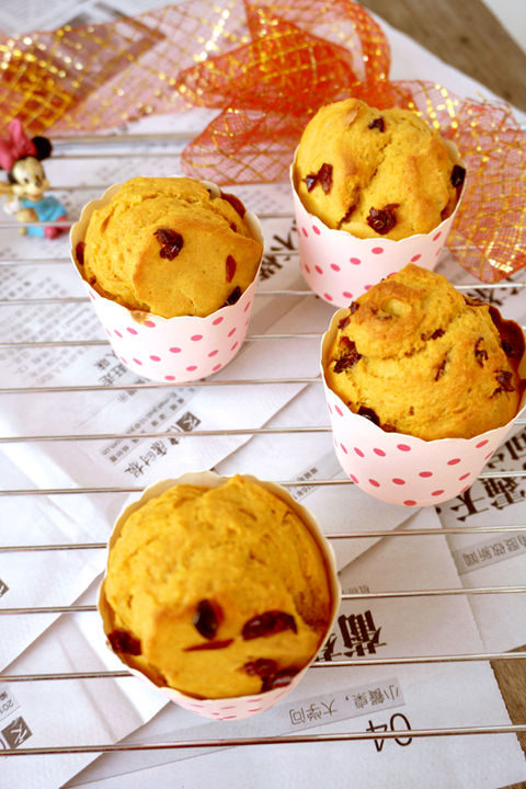 用料:芒果泥95克,細砂糖20克,玉米油20克,雞蛋1個,低筋粉90克,牛奶10克,泡打粉1小勺,蔓越莓干15克
