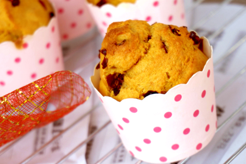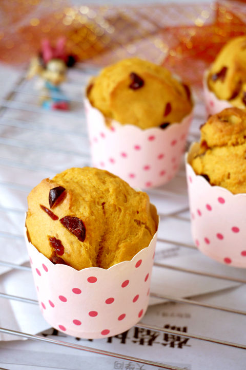 2、裝入紙杯中,七八分滿,表面撒少許蔓越莓點綴。放入烤箱,中層,上下火180度,烤約25-30分鐘。表面輕微上色,出爐。