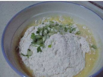 2、蔥花、雞蛋、面粉混合,加入水拌成可流動(dòng)的糊狀。