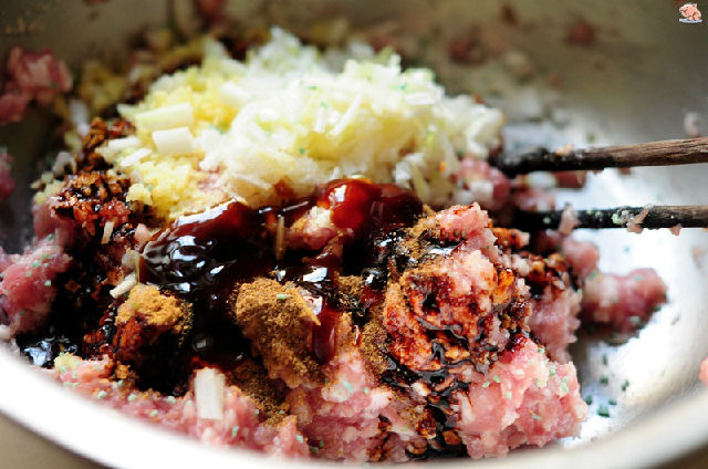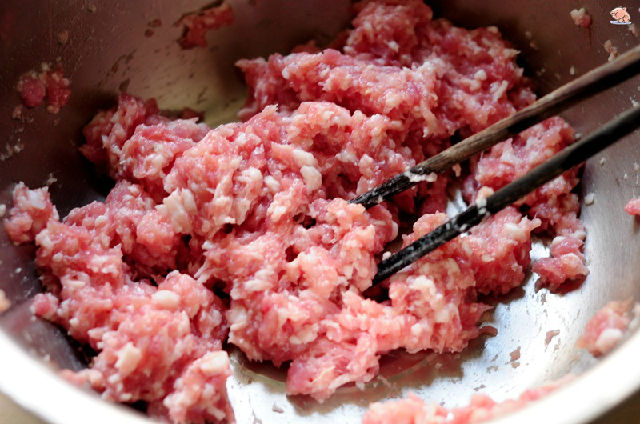 2,肉餡加入少許水和鹽攪打至有粘性。