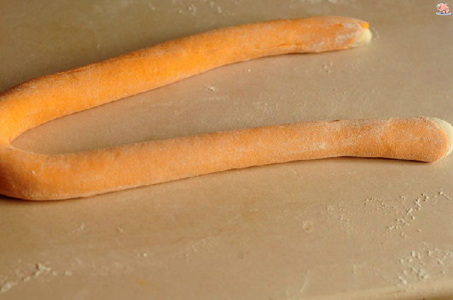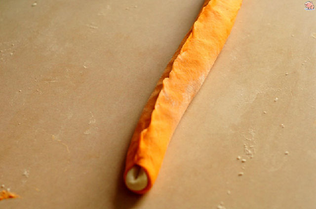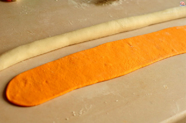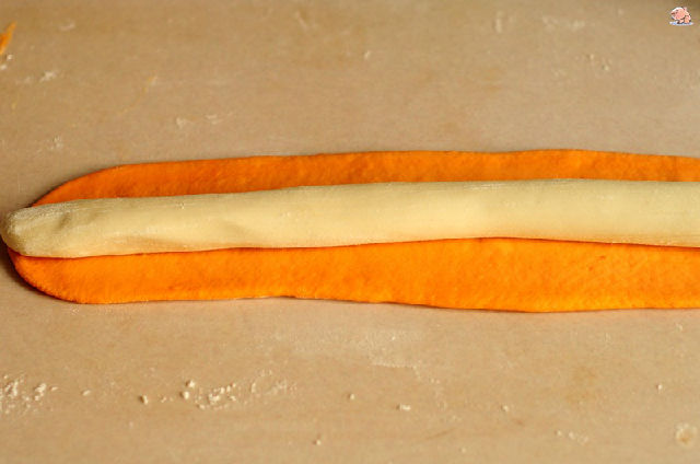 8,把白色面團揉成長條,胡蘿卜面團搟成同等長的面片。