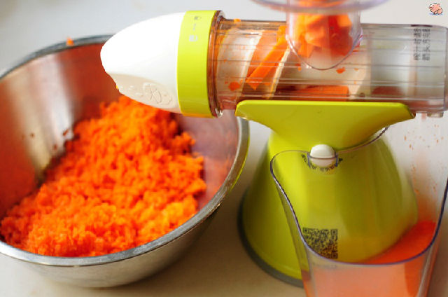1,胡蘿卜(約2根)切成細長條,用原汁機渣汁分離。