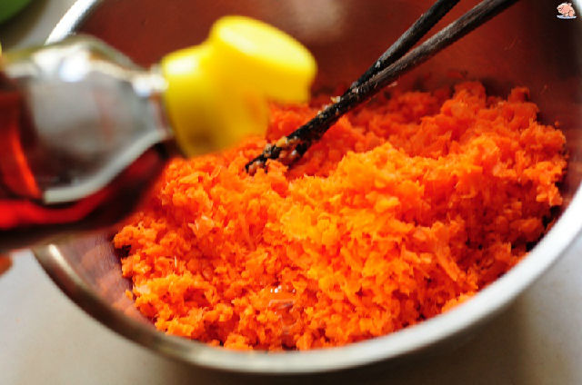 5,胡蘿卜渣也放入適量香油拌勻。