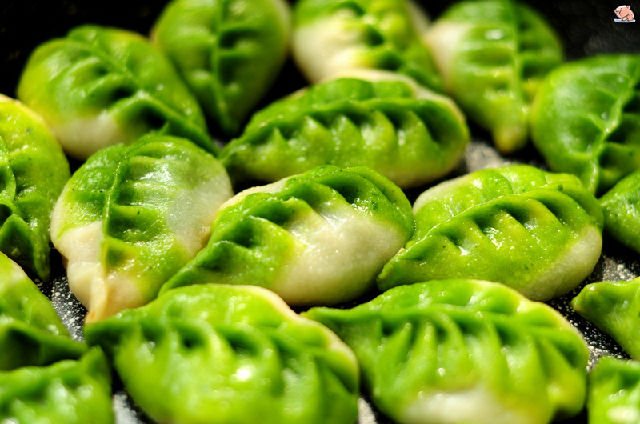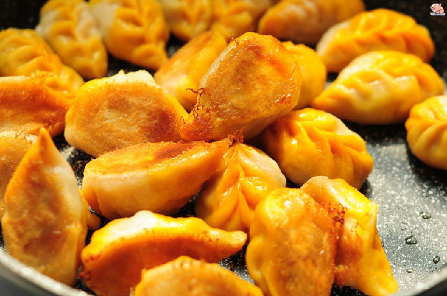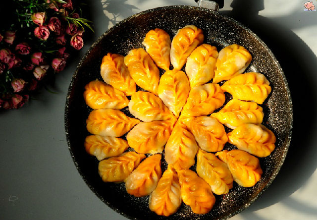 17,平底鍋內(nèi)加入少許底油,把餃子平鋪。