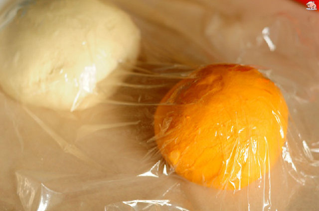 7,把兩種餃子皮原料分別揉光滑,蓋上保鮮膜醒15分鐘。