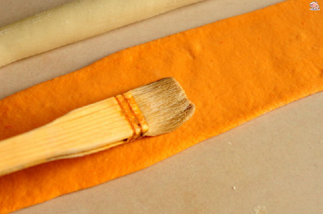 9,為了使兩種顏色的面團能夠充分貼合,胡蘿卜面片上要刷一層水。