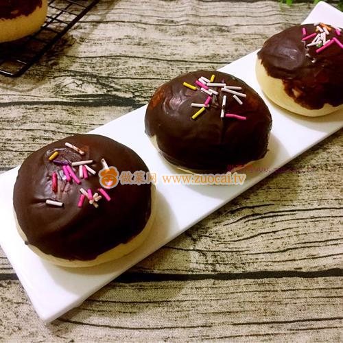 16.把面包頂部放入巧克力中沾上一層巧克力