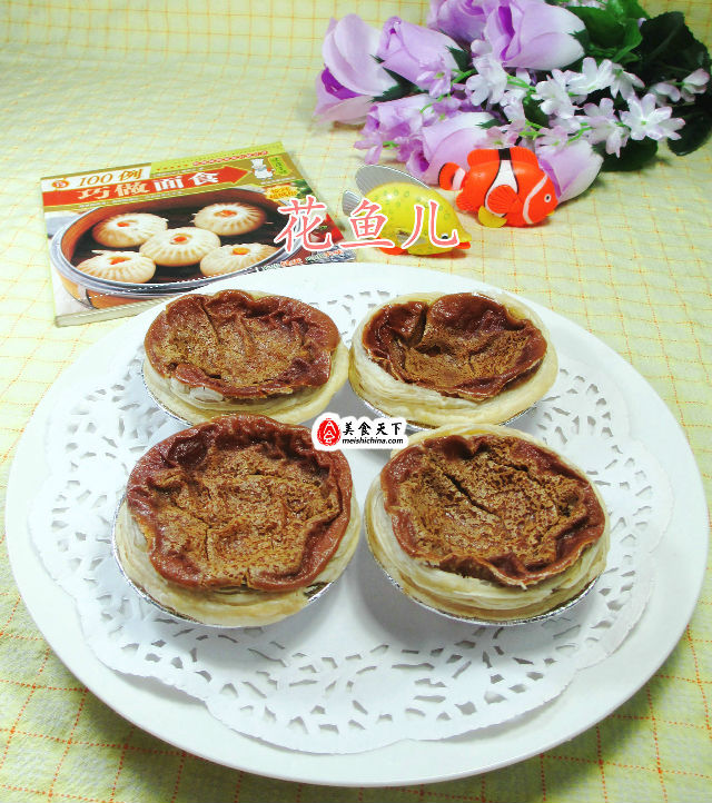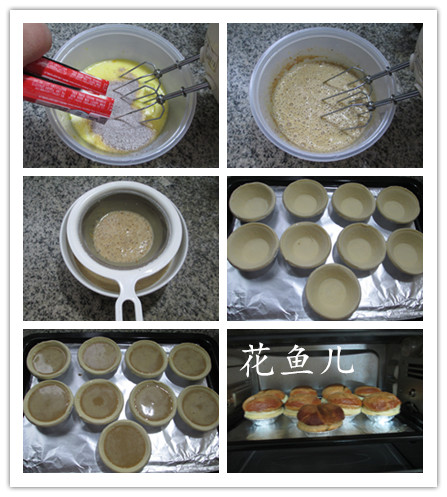 (4)然后,將蛋撻皮置入烤盤中,用勺子舀入咖啡蛋液。
