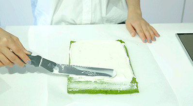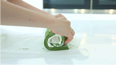 11、取凝固好的紅豆奶凍放在抹好奶油的抹茶蛋糕胚上,然后從底部向前卷起。卷好后放入冰箱冷藏10分鐘定型后取出,切片裝盤。美好的下午茶時光即將開始啦~