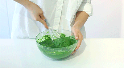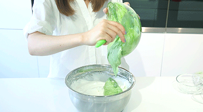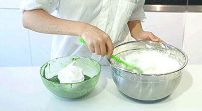 5、取1/3打發(fā)蛋白跟抹茶面糊攪拌均勻后,再倒回盆中跟剩下蛋白攪拌均勻。