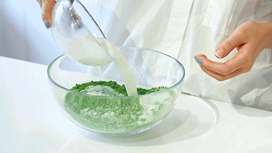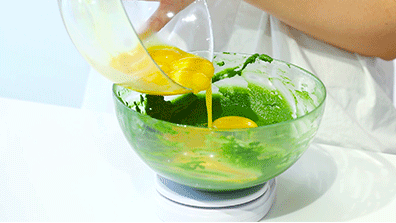 2、將牛奶色拉油混合后,倒入剛才過篩的抹茶面粉碗中進(jìn)行攪拌。
