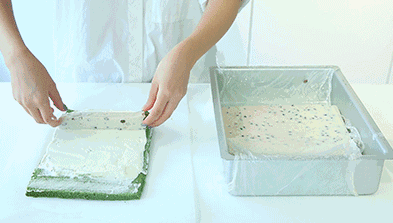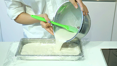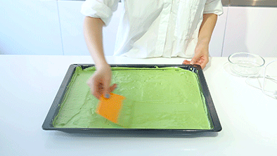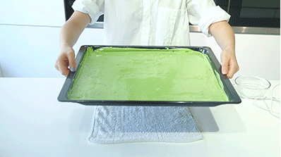 6、將面糊倒入烤盤鋪平,放入烤箱前,如上圖將烤盤從空中垂直下落,震出氣泡為好,這樣可以使面糊緊貼烤盤。放入烤箱烤制8分鐘,可以在蛋糕中間插竹簽確認(rèn)是否烤熟。
